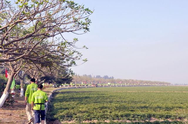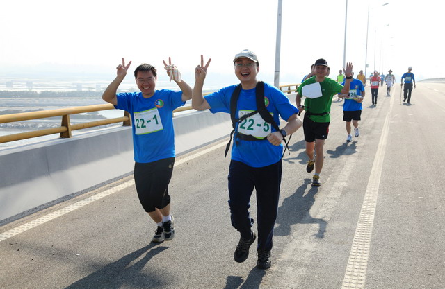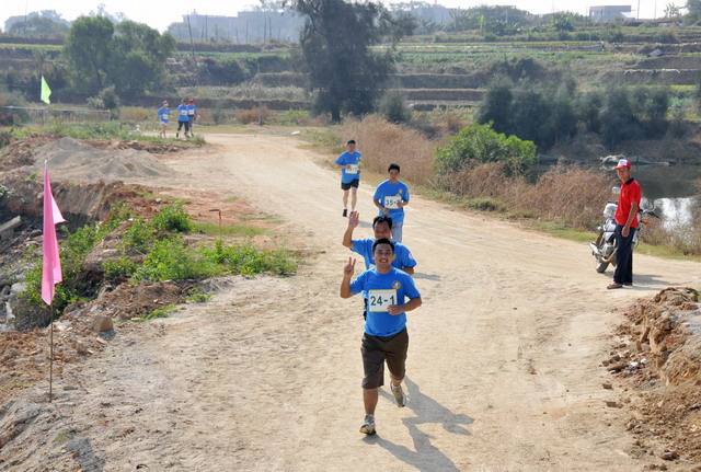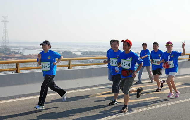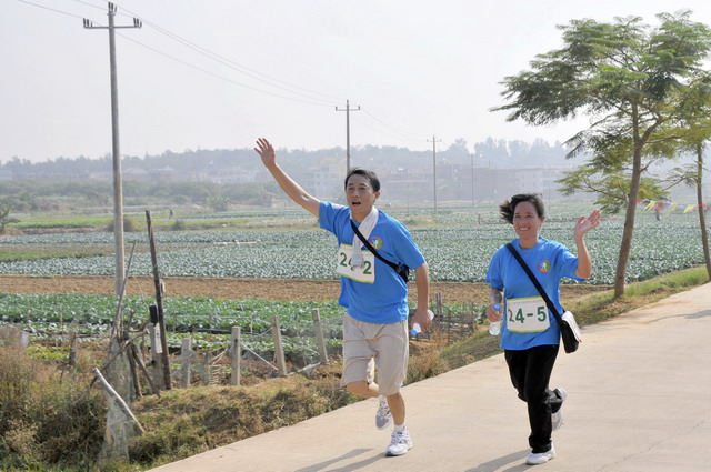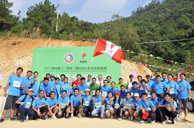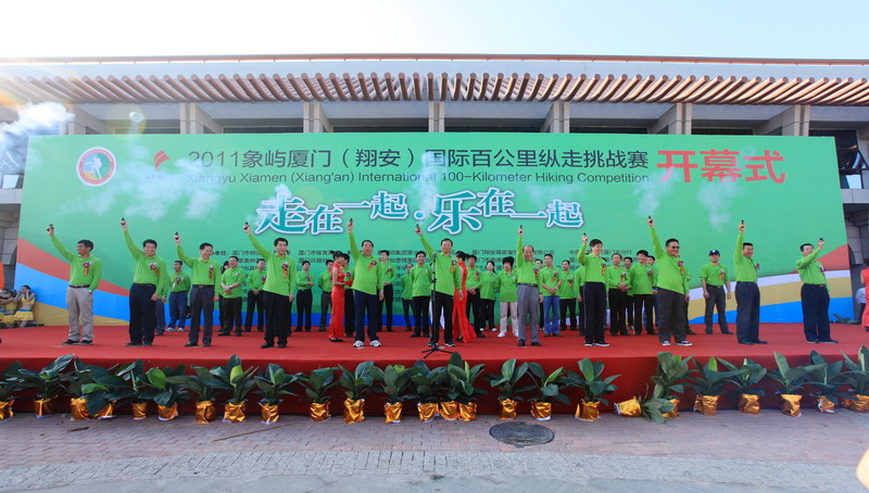 11月5日8時09分,明媚秋光里,廈門市委常委、副市長臧杰斌宣布2011象嶼廈門(翔安)國際百公里縱走挑戰(zhàn)賽開始,廈門市人大常委會副主任黃杰成、廈門市政協(xié)副主席陳昌生、國家奧林匹克體育中心副主任彭維勇、象嶼集團(tuán)總裁張水利等一起為比賽鳴槍。來自28個國家和地區(qū)的近萬名運動愛好者,從大嶝小鎮(zhèn)·臺灣免稅公園廣場出發(fā),穿越田野、海濱、山巒、閩南古厝,開始了一段挑戰(zhàn)自我的征途。這其中,由象嶼集團(tuán)員工及家屬、合作伙伴、共建單位等組成的千人象嶼團(tuán)隊分外引人注目,浩浩蕩蕩的象嶼人走在一起、樂在一起,在欣賞沿途自然、人文風(fēng)光的同時,也享受著挑戰(zhàn)自我、永不止步的健康向上,享受著與同事、親朋共度美好秋假的怡然歡樂。