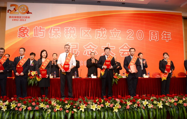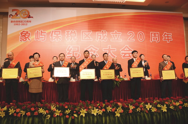 11月28日上午,在慶祝廈門象嶼保稅區(qū)成立20周年的喜慶日子里,廈門市委、市政府隆重舉行慶祝大會,回顧保稅區(qū)20年的奮斗歷程,總結保稅區(qū)20年的發(fā)展經(jīng)驗,展望保稅區(qū)更加美好的發(fā)展未來。為保稅區(qū)建設立下汗馬功勞的10家突出貢獻企業(yè)和10位突出貢獻個人受到了隆重表彰。其中,廈門象嶼集團有限公司、廈門象嶼股份有限公司榮獲突出貢獻企業(yè),象嶼集團黨委書記、董事長王龍雛,象嶼建設集團常務副總經(jīng)理王澍陶榮獲突出貢獻個人。