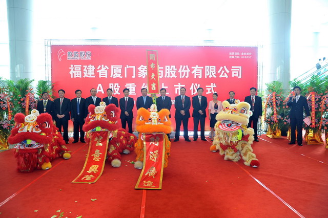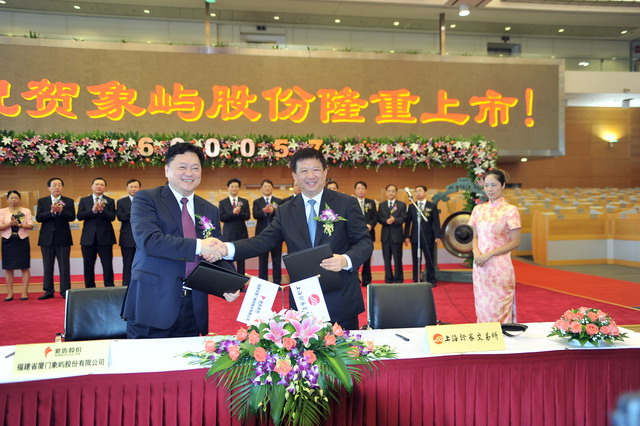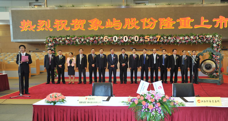 2011年8月29日,福建省廈門象嶼股份有限公司在上海證券交易所舉行隆重的重組上市儀式。廈門市人民政府葉重耕副市長及象嶼股份王龍雛董事長共同敲鑼開盤。象嶼股份股價(jià)高開逾1倍,開盤價(jià)8.25元,早市最高漲127.5%。截至早市收盤,報(bào)8.29元,漲108.29%。